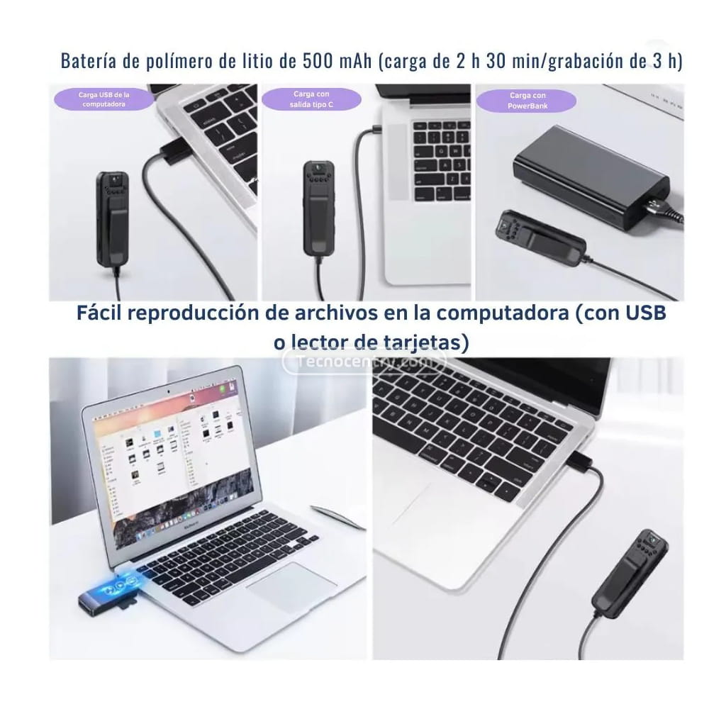 Con una batería recargable de larga duración, podrás grabar durante horas sin interrupciones. La transferencia de archivos es rápida y sencilla, permitiéndote descargar y revisar el material en tu computadora o dispositivo compatible.