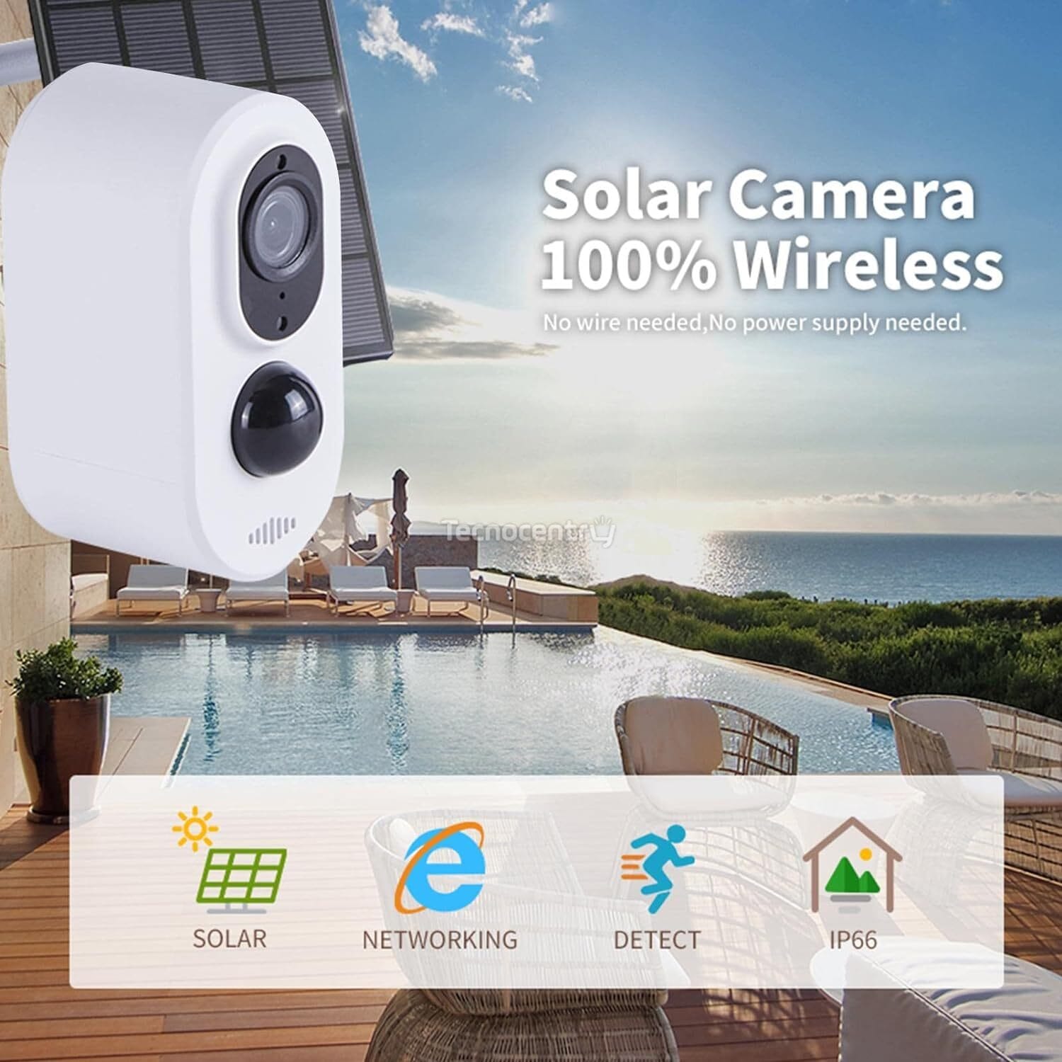 La cámara de seguridad para exteriores puede proporcionar energía solar continua de día o de noche, con sol o lluvia.