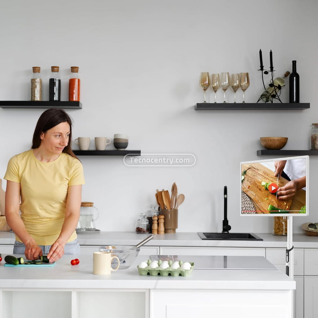 Funciona tanto conectada a corriente como de forma recargable, brindando movilidad y flexibilidad en diferentes espacios como tiendas, ferias, salas de espera, oficinas, restaurantes o eventos comerciales. Su base con ruedas facilita el traslado y manejo, permitiendo moverla sin esfuerzo entre áreas.
