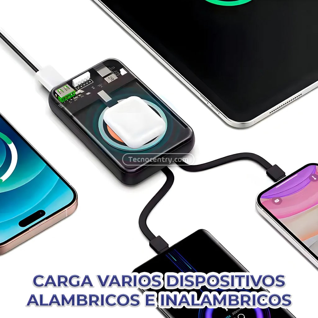 3 puertos de entrada (Tipo C, iPhone, micro), 6 output ports (Type-C self-contained line output, iPhone self-contained line output, USB self-contained line output, Type-C, USB-A output y Qi inalámbrico 15W) output5V/3.0A, incorporados IC inteligente que permiten cargar sus dispositivos a la velocidad del adaptador original. Los 5 puertos de salida te permiten cargar los 5 dispositivos al mismo tiempo o compartirlos con tu familia y amigos.