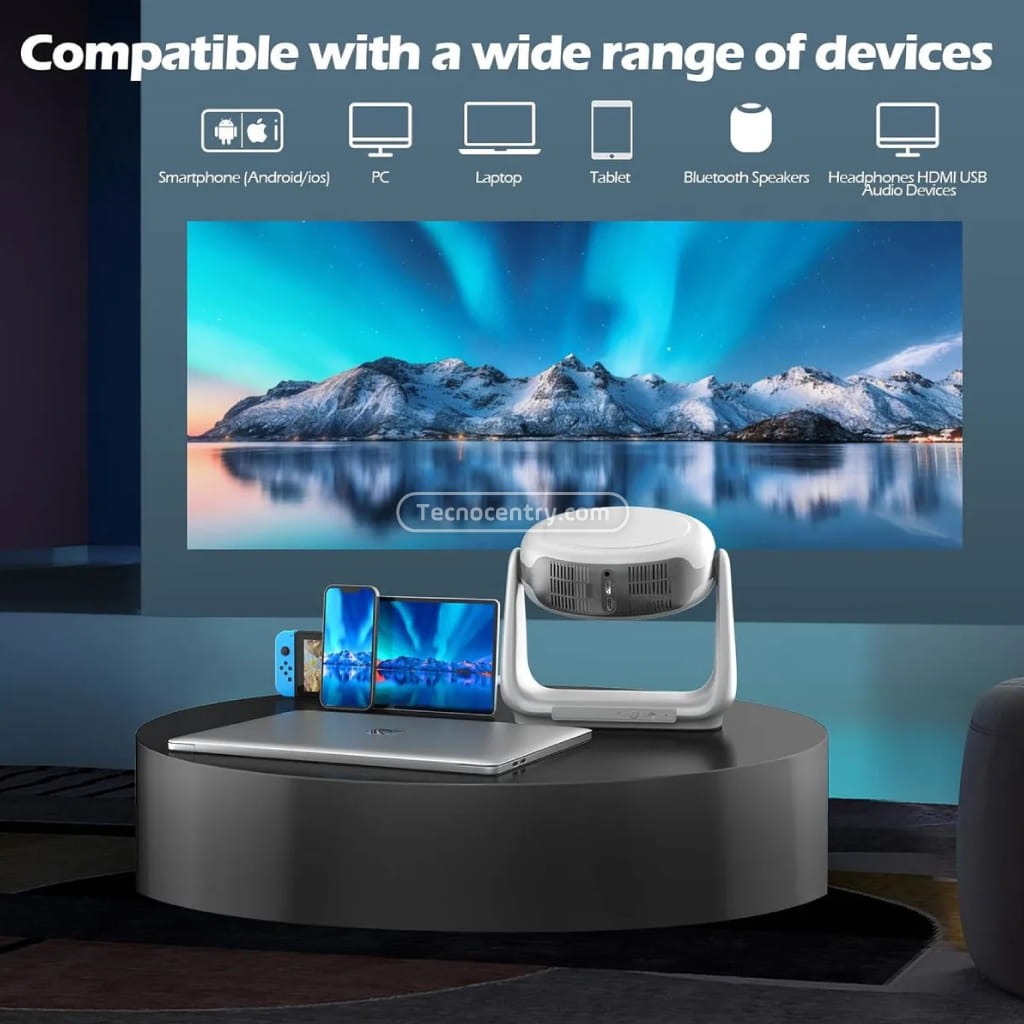 Proyector Portátil autoajustable Full HD 4K Nativo con lámpara incluida. Integrado con Android 11 y parlante.