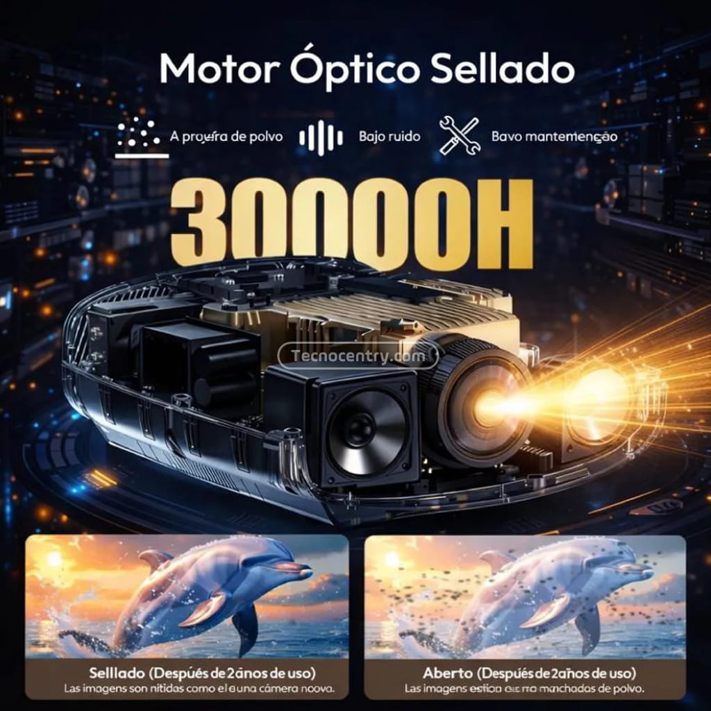 de un sonido envolvente con dos altavoces estéreo de 10 W (20 W en total), eliminando la necesidad de altavoces externos en la mayoría de los casos. La tecnología de óptica totalmente sellada protege contra el polvo, garantizando una vida útil del LED de 30 000 horas y un funcionamiento silencioso y estable sin pérdida de brillo con el tiempo. Conectividad completa y garantía con soporte local