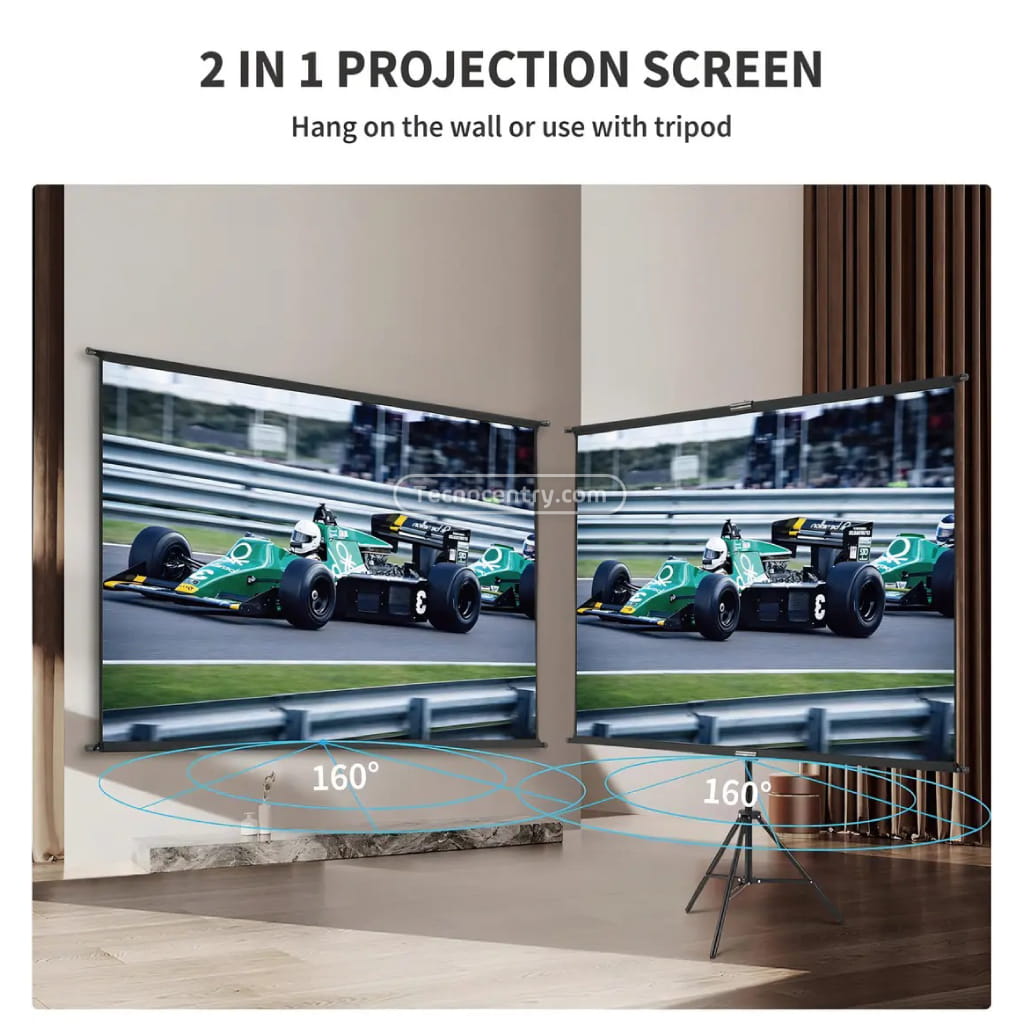 Diseñamos esta pantalla de proyector, ya sea puede usarla con trípode o puede colgarla en la pared sin el soporte, los dos modelos son adecuados para su uso según el entorno.